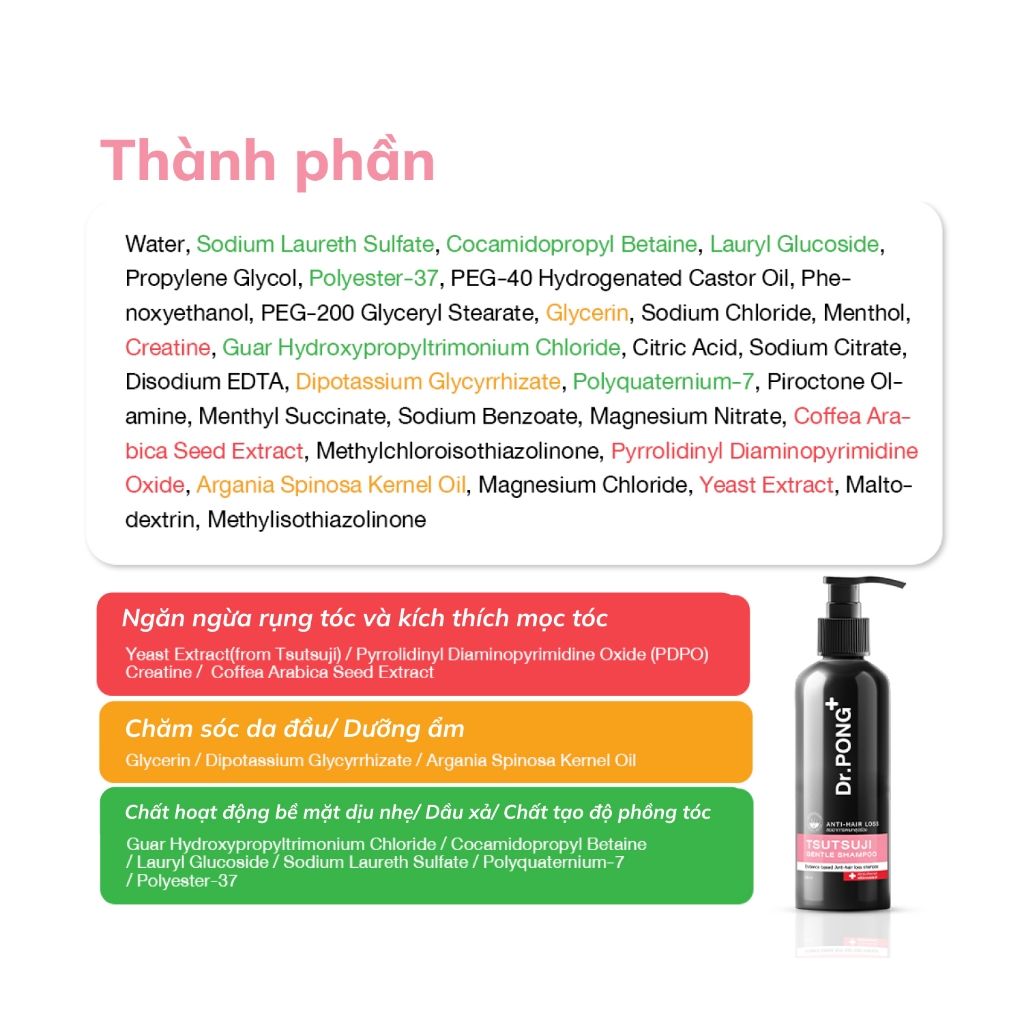 Ammonium Lauryl Sulfate, Cocamidopropyl Betaine, Sodium Cocoyl Glycinate, PEG-7 Glyceryl Cocoate, Coco-Glucoside: Làm sạch nhẹ nhàng mà không làm mất đi lớp dầu tự nhiên của da đầu.