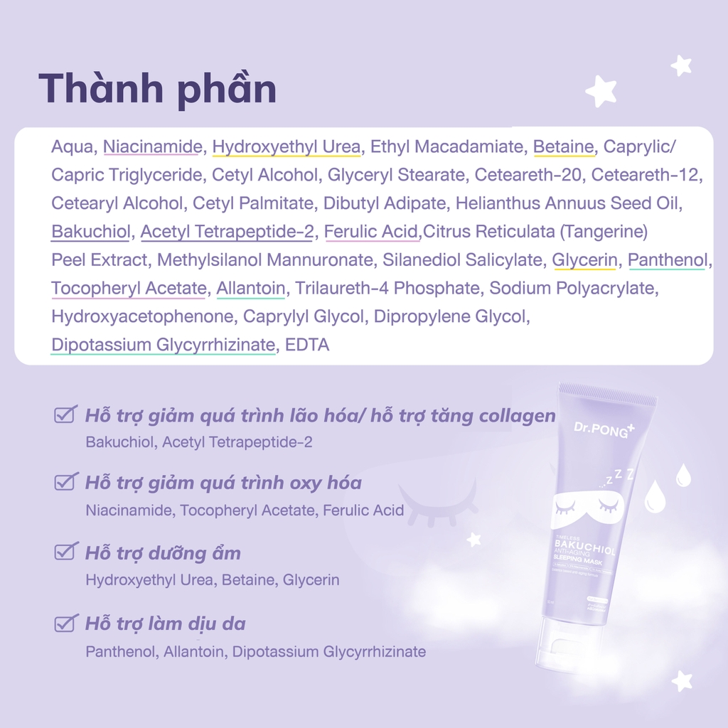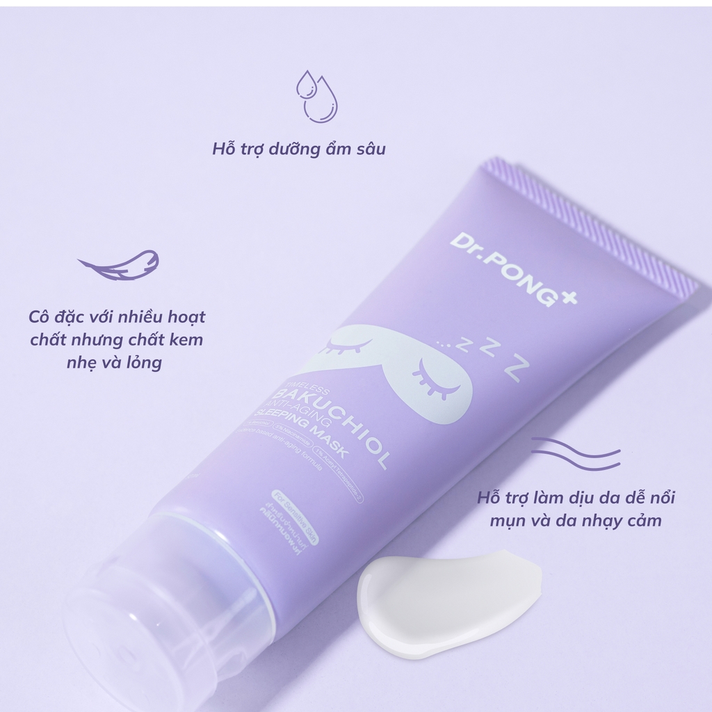 Mặt nạ ngủ làm chậm lão hoá da Dr.PONG là sự kết hợp giữa các thành phần hỗ trợ chống nhăn da, giúp da săn chắc và làm chậm quá trình lão hoá như Bakuchiol 1% và Niacinamide. Sản phẩm hỗ trợ tăng cường giúp sản sinh collagen, mang lại làn da đàn hồi và ẩm mượt từ sâu bên trong.