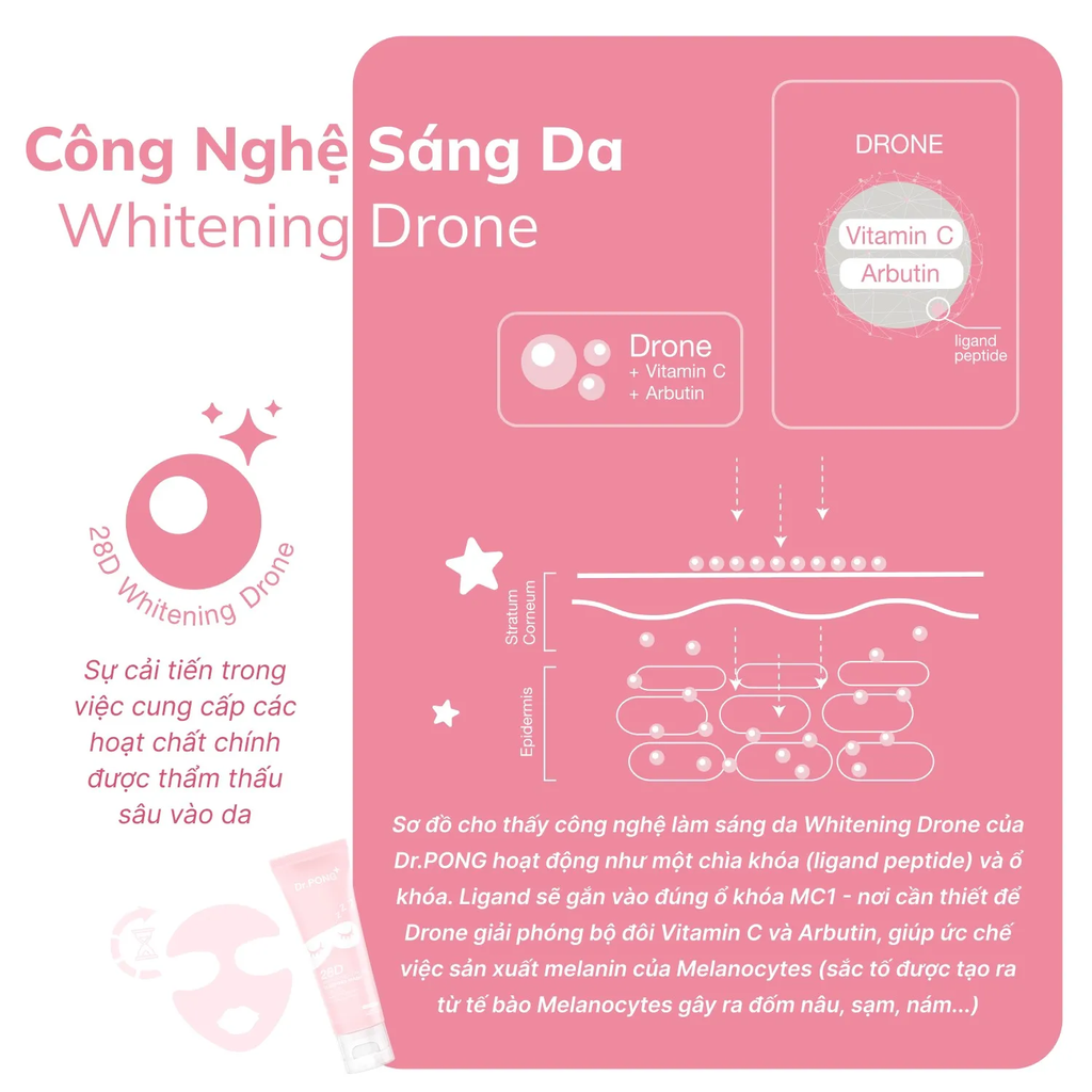 - Whitening Drone: Giúp vận chuyển hoạt chất đến trực tiếp tế bào sắc tố, tăng hiệu quả làm sáng da.