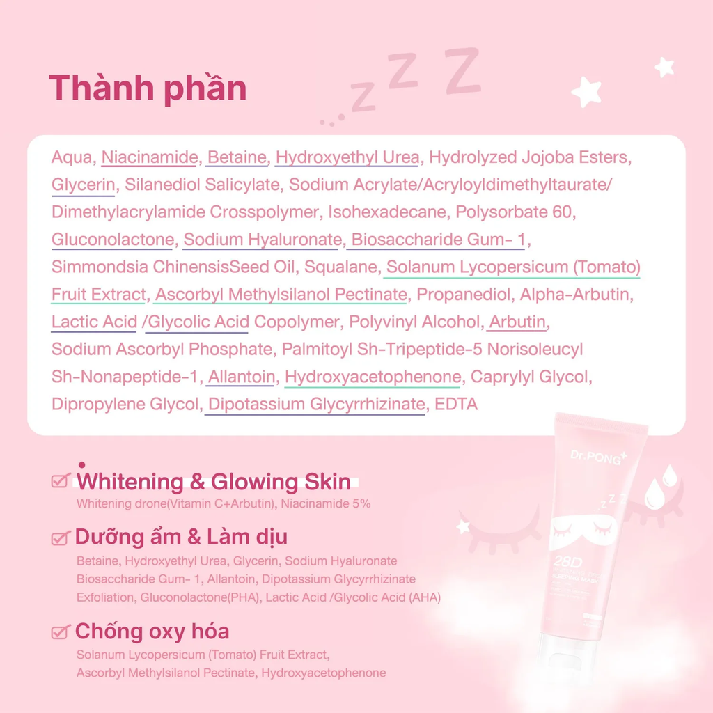 Mặt nạ ngủ làm sáng da Dr.PONG với tác động kép giúp da vừa ẩm mượt suốt đêm dài, vừa hỗ trợ làm mờ thâm mụn và dưỡng sáng da ngay cả trong giấc ngủ.
