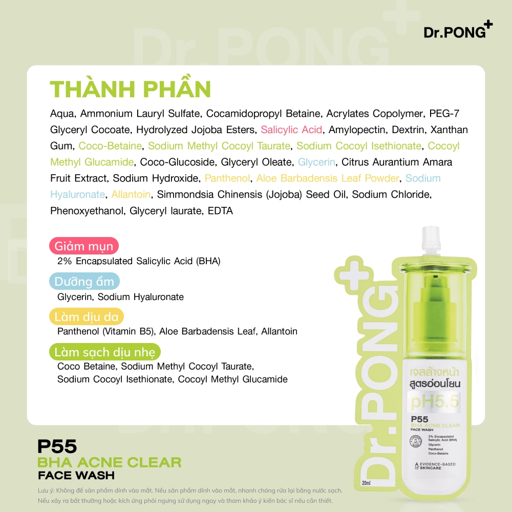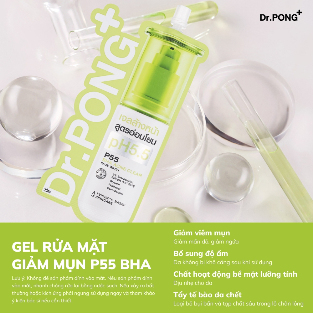 Gel rửa mặt giảm mụn Dr.PONG p55 BHA Acne Clear Face Wash 20ml