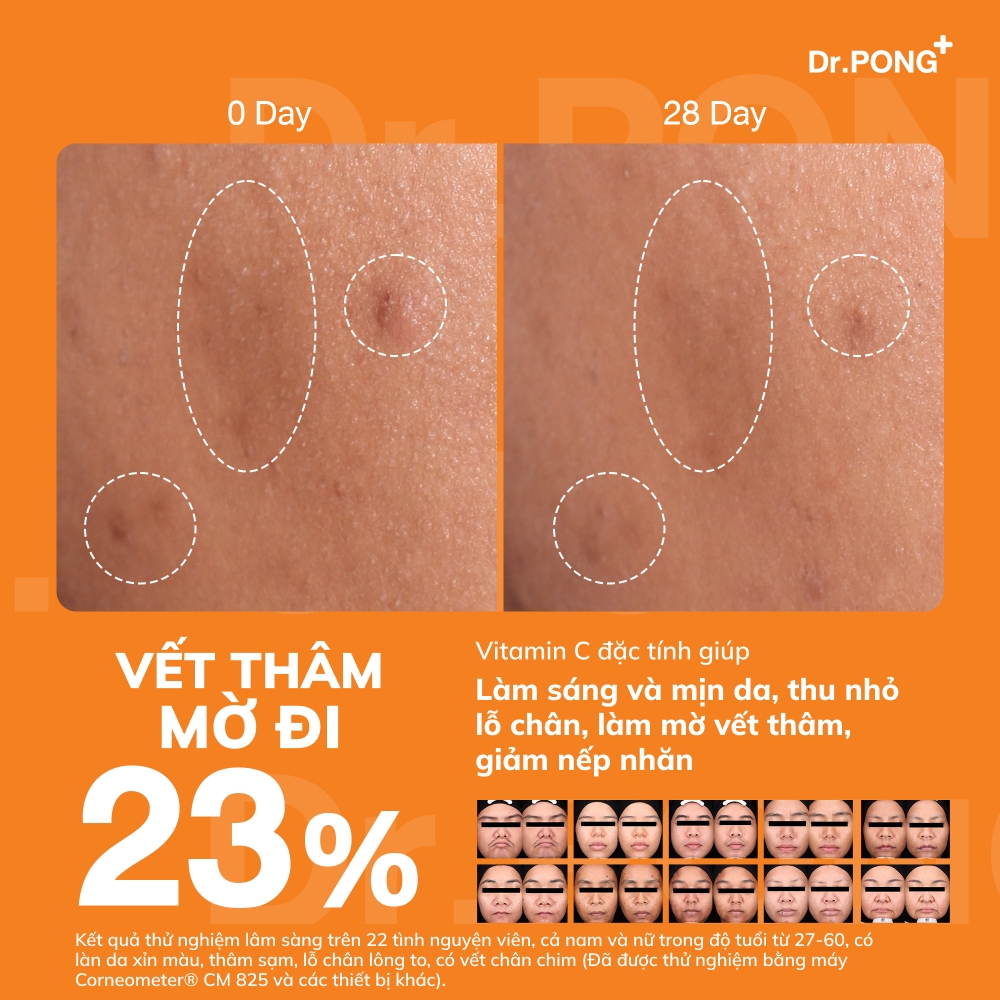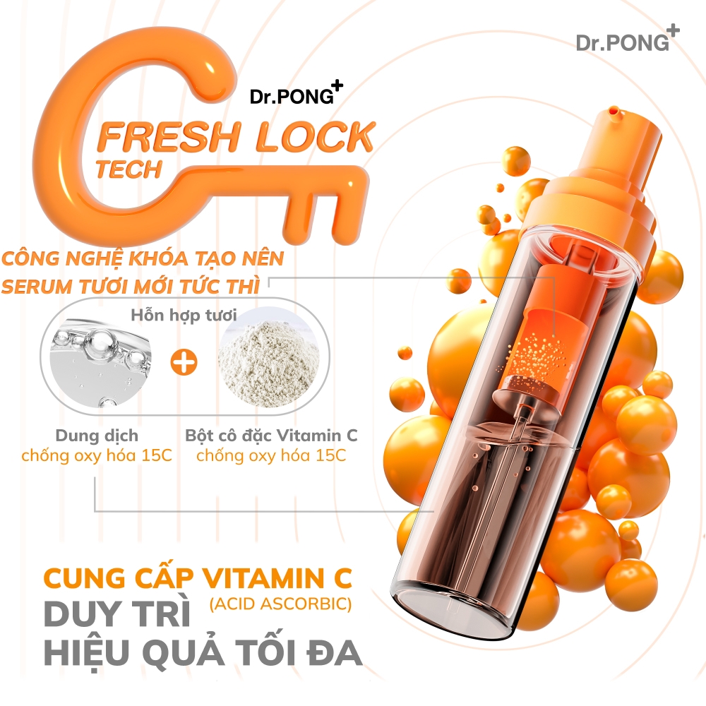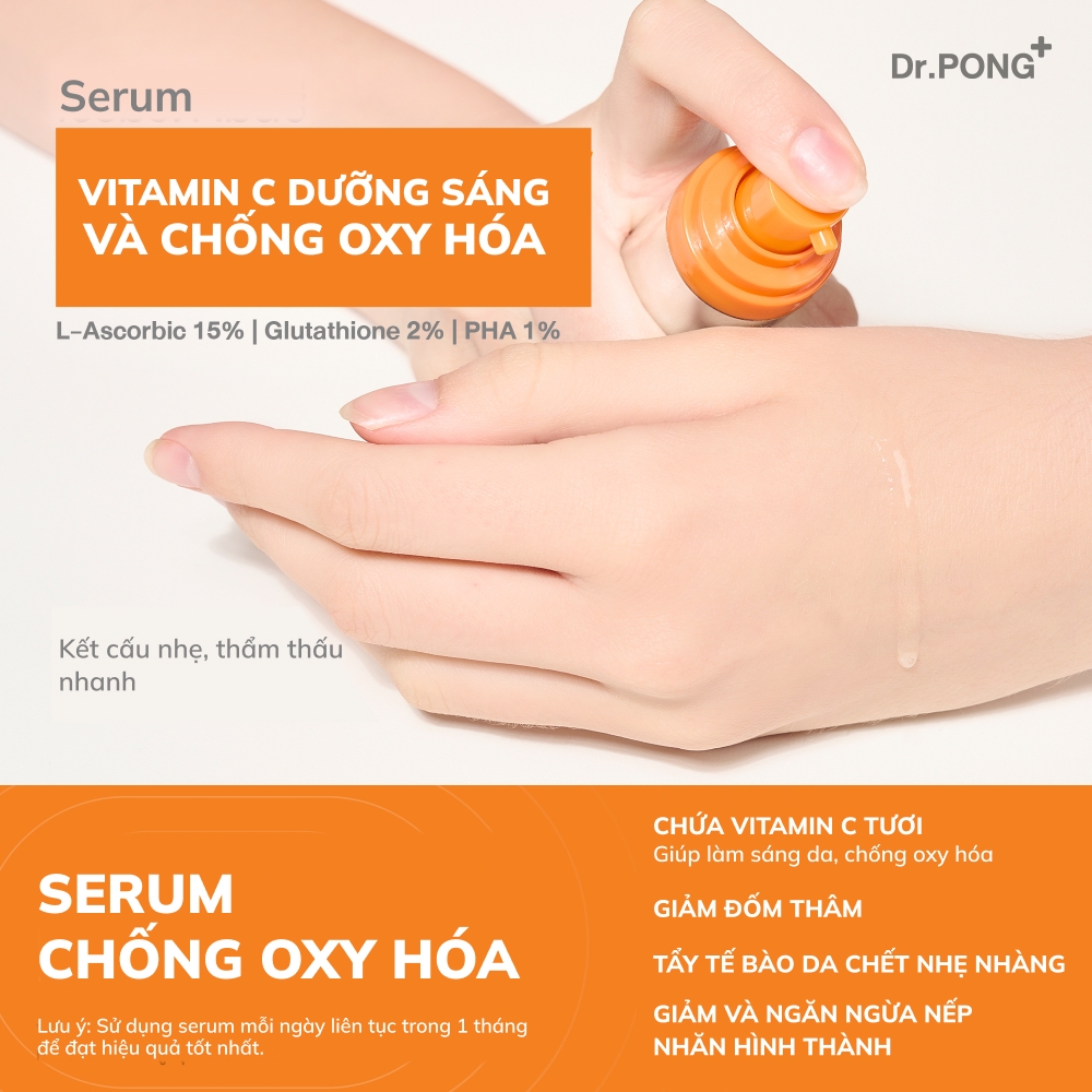 Serum Vitamin C Dr.PONG chứa 15% Vitamin C tinh khiết với kết cấu lỏng nhẹ kết hợp cùng Niacinamide và Ferulic Acid hỗ trợ dưỡng trắng, mờ thâm, chống oxy hoá và thu nhỏ lỗ chân lông hiệu quả.