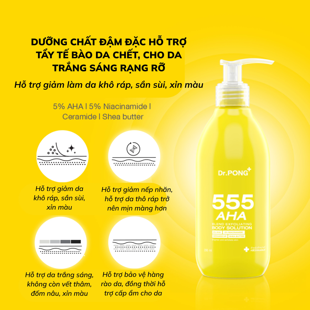 Sữa tẩy tế bào da chết, dưỡng ẩm và sáng da Dr.PONG 555 AHA với công thức cải tiến chứa 4 loại AHA kết hợp cùng Niacinamide mang đến một làn da căng mướt và mềm mịn. Kết cấu dịu nhẹ mang đến lớp màng ẩm và hàng rào tự nhiên bảo vệ làn da.