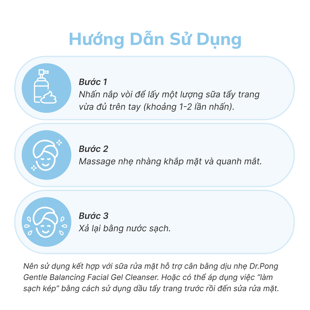 Sữa tẩy trang Dr.PONG giúp làm sạch nhẹ nhàng lớp trang điểm, kem chống nắng, bụi bẩn mà không gây khô da hay kích ứng. Kết cấu dạng sữa chứa công thức dịu nhẹ, không gây bít tắc lỗ chân lông, phù hợp cho mọi loại da, kể cả da nhạy cảm dễ nổi mụn.